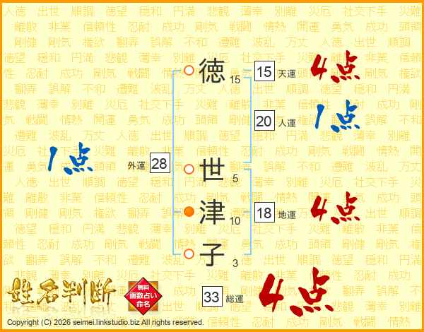徳世津子さんの総運は33画の4点!
