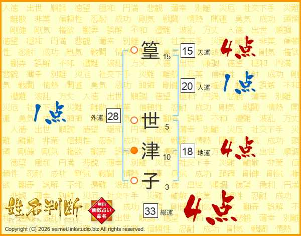 生活面を象徴する運勢です。外部から受ける影響力を表し、結婚運、家庭運や職場、環境への順応性を表します。総運から人運を引いた画数。姓や名が1文字の場合を除く。