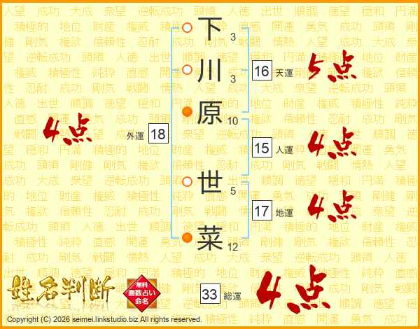 下(3画)川(3画)原(10画) 世(5画)菜(12画)