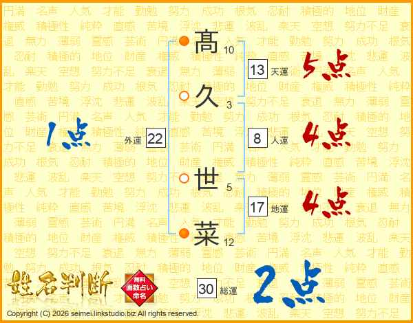 髙久世菜さんの天運は13画の5点!
