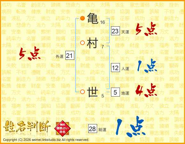 生活面を象徴する運勢です。外部から受ける影響力を表し、結婚運、家庭運や職場、環境への順応性を表します。総運から人運を引いた画数。姓や名が1文字の場合を除く。