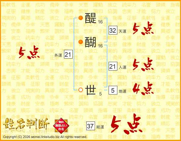 醍醐世さんの総運は37画の5点!