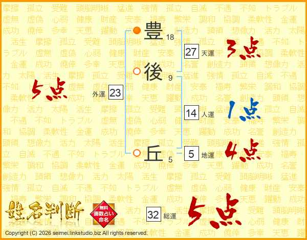 生活面を象徴する運勢です。外部から受ける影響力を表し、結婚運、家庭運や職場、環境への順応性を表します。総運から人運を引いた画数。姓や名が1文字の場合を除く。
