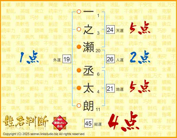 一(1画)之(3画)瀬(20画) 丞(6画)太(4画)朗(11画)