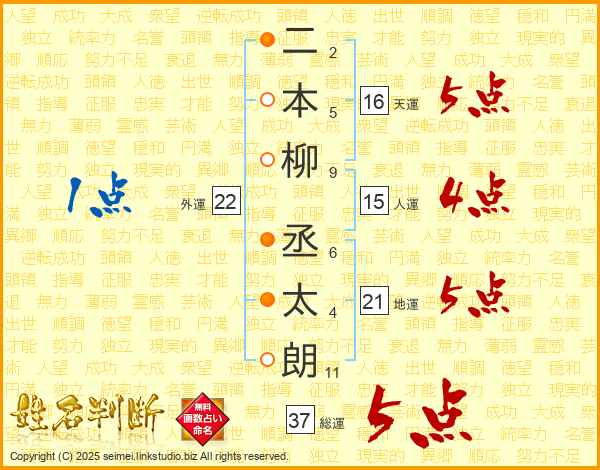 二(2画)本(5画)柳(9画) 丞(6画)太(4画)朗(11画)