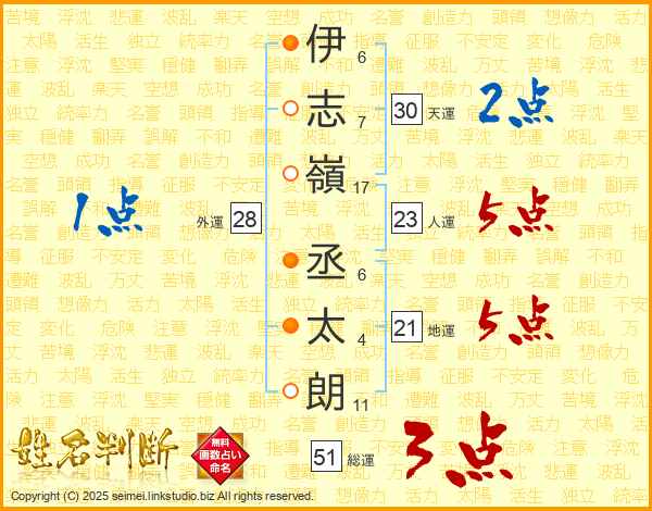 伊(6画)志(7画)嶺(17画) 丞(6画)太(4画)朗(11画)