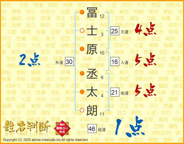 冨(12画)士(3画)原(10画) 丞(6画)太(4画)朗(11画)