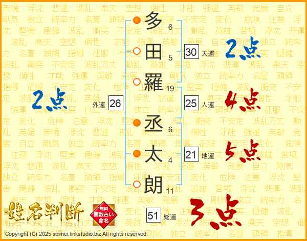 多(6画)田(5画)羅(19画) 丞(6画)太(4画)朗(11画)
