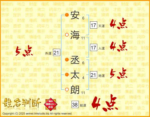 安(6画)海(11画) 丞(6画)太(4画)朗(11画)