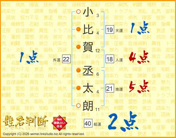小(3画)比(4画)賀(12画) 丞(6画)太(4画)朗(11画)
