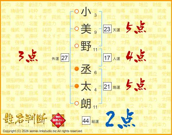 小(3画)美(9画)野(11画) 丞(6画)太(4画)朗(11画)