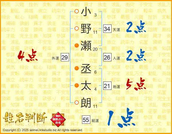 小(3画)野(11画)瀬(20画) 丞(6画)太(4画)朗(11画)