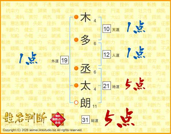 木(4画)多(6画) 丞(6画)太(4画)朗(11画)