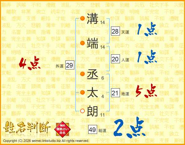 溝(14画)端(14画) 丞(6画)太(4画)朗(11画)