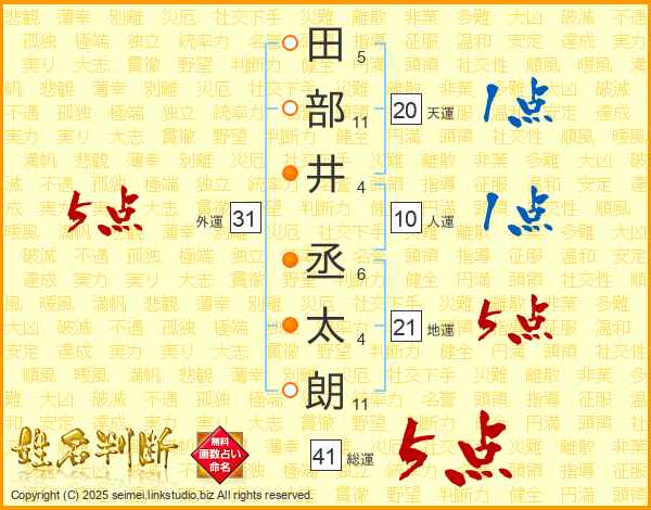 田(5画)部(11画)井(4画) 丞(6画)太(4画)朗(11画)