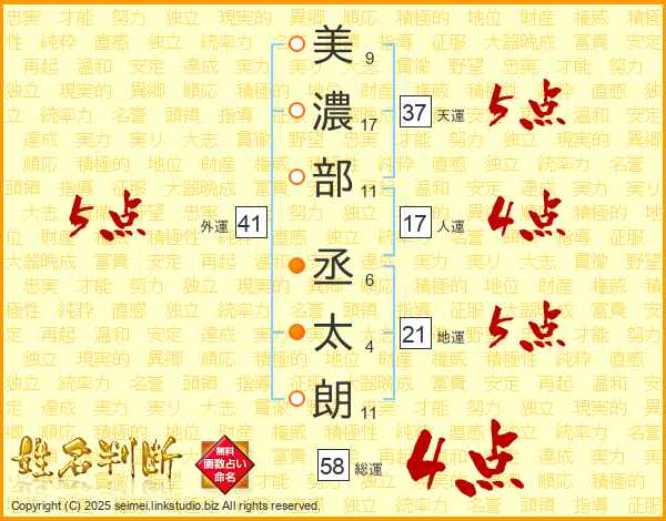 美(9画)濃(17画)部(11画) 丞(6画)太(4画)朗(11画)