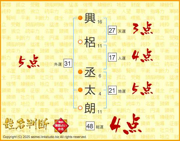 興(16画)梠(11画) 丞(6画)太(4画)朗(11画)