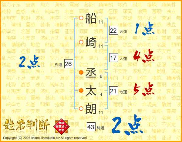 船(11画)崎(11画) 丞(6画)太(4画)朗(11画)