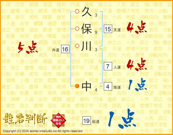 生活面を象徴する運勢です。外部から受ける影響力を表し、結婚運、家庭運や職場、環境への順応性を表します。総運から人運を引いた画数。姓や名が1文字の場合を除く。