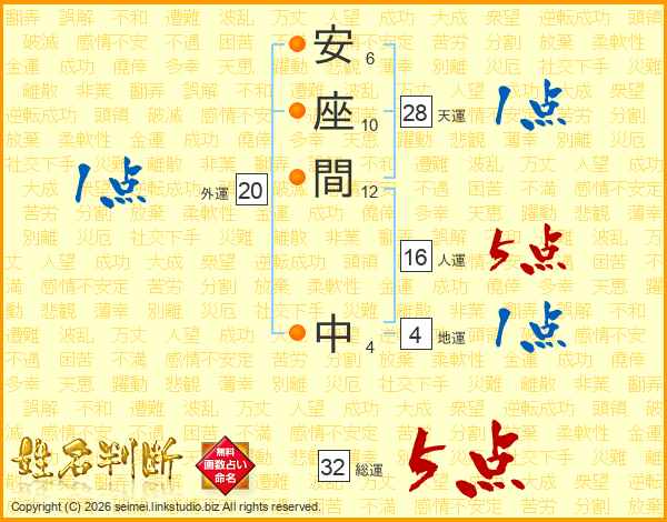 生活面を象徴する運勢です。外部から受ける影響力を表し、結婚運、家庭運や職場、環境への順応性を表します。総運から人運を引いた画数。姓や名が1文字の場合を除く。