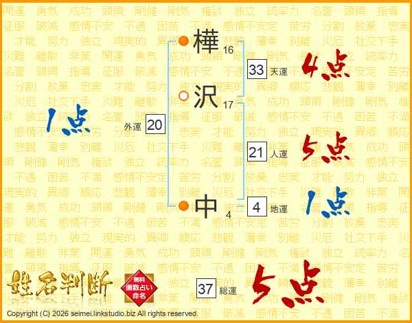 生活面を象徴する運勢です。外部から受ける影響力を表し、結婚運、家庭運や職場、環境への順応性を表します。総運から人運を引いた画数。姓や名が1文字の場合を除く。