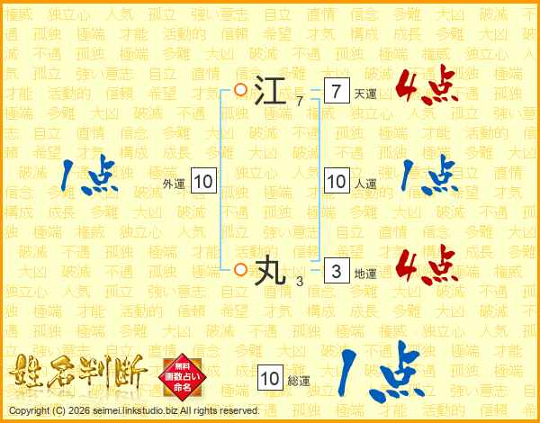 生活面を象徴する運勢です。外部から受ける影響力を表し、結婚運、家庭運や職場、環境への順応性を表します。総運から人運を引いた画数。姓や名が1文字の場合を除く。