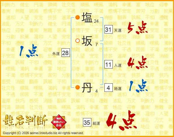 生活面を象徴する運勢です。外部から受ける影響力を表し、結婚運、家庭運や職場、環境への順応性を表します。総運から人運を引いた画数。姓や名が1文字の場合を除く。