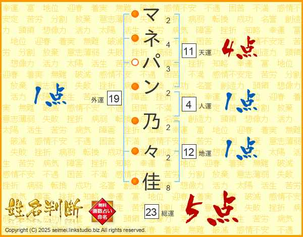 生活面を象徴する運勢です。外部から受ける影響力を表し、結婚運、家庭運や職場、環境への順応性を表します。総運から人運を引いた画数。姓や名が1文字の場合を除く。