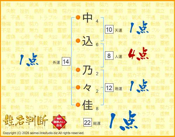 中(4画)込(6画) 乃(2画)々(2画)佳(8画)