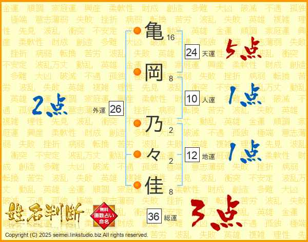 亀(16画)岡(8画) 乃(2画)々(2画)佳(8画)