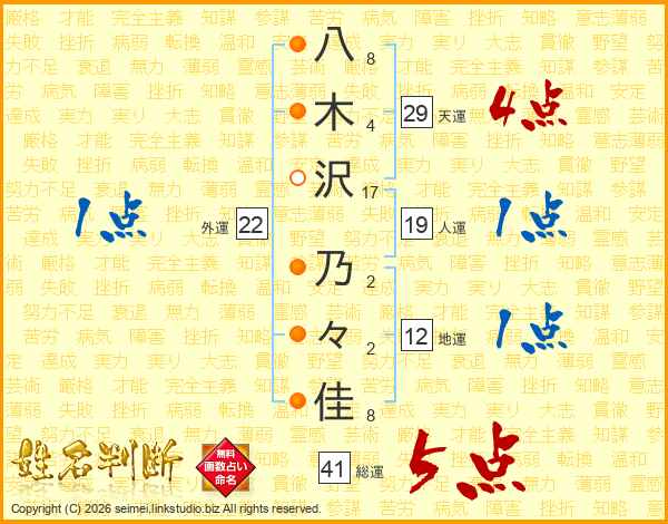 八(8画)木(4画)沢(17画) 乃(2画)々(2画)佳(8画)