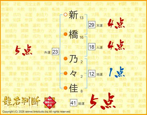 新(13画)橋(16画) 乃(2画)々(2画)佳(8画)