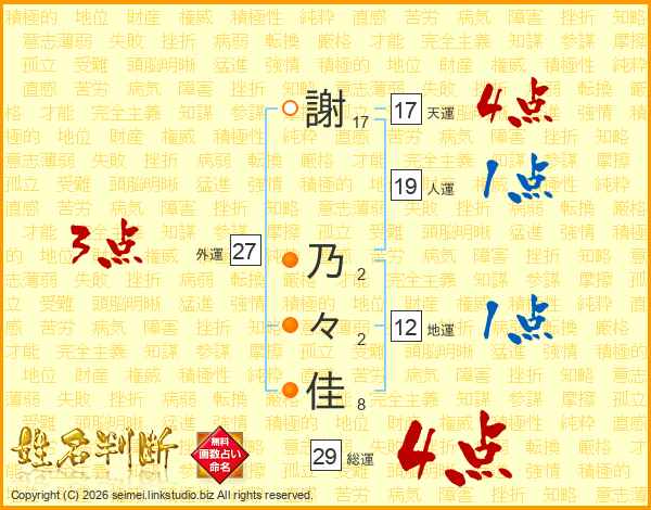 謝(17画) 乃(2画)々(2画)佳(8画)