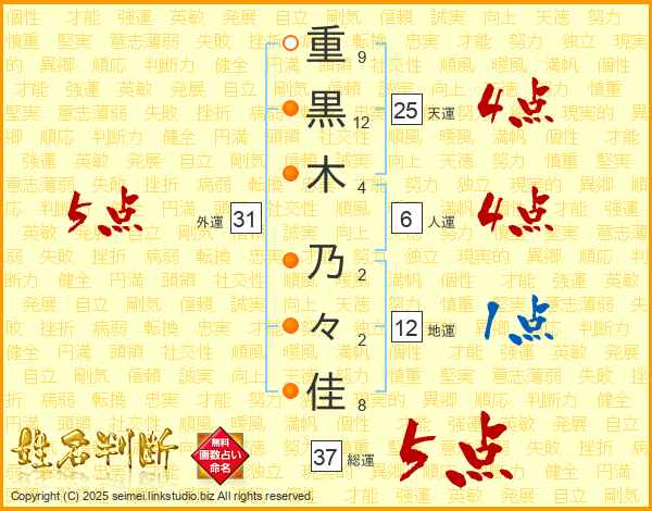 重(9画)黒(12画)木(4画) 乃(2画)々(2画)佳(8画)