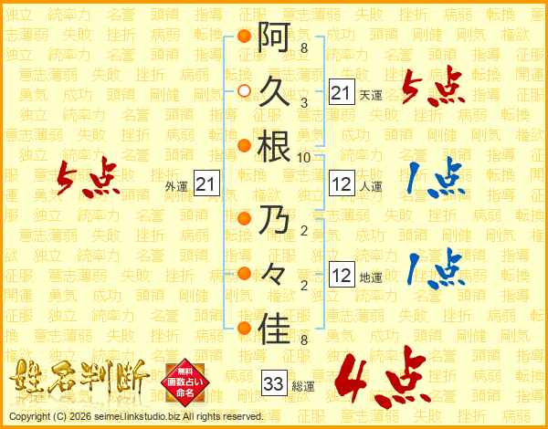 阿(8画)久(3画)根(10画) 乃(2画)々(2画)佳(8画)