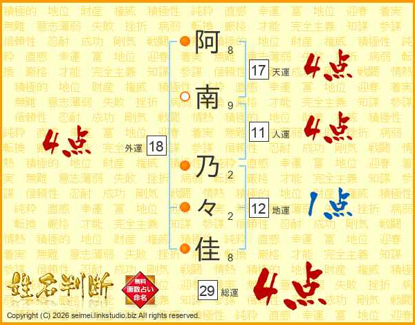 阿(8画)南(9画) 乃(2画)々(2画)佳(8画)