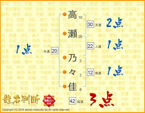 高(10画)瀬(20画) 乃(2画)々(2画)佳(8画)