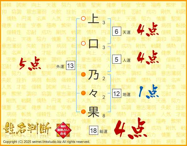 上(3画)口(3画) 乃(2画)々(2画)果(8画)