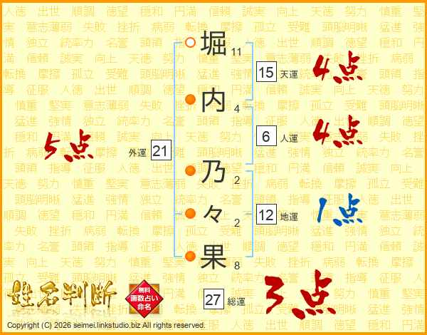 堀(11画)内(4画) 乃(2画)々(2画)果(8画)