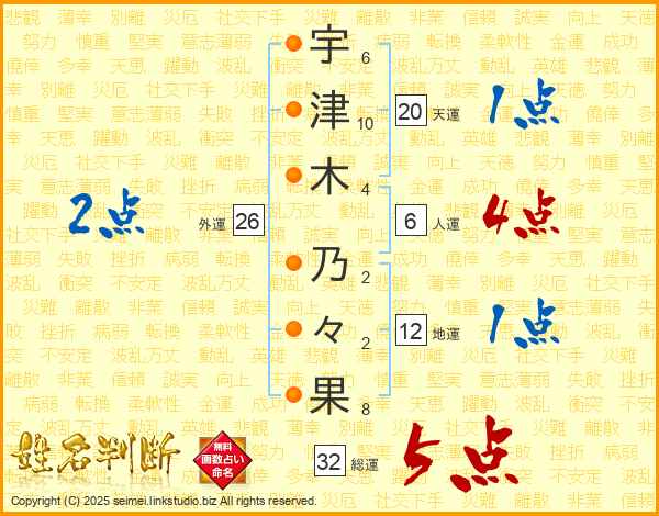 宇(6画)津(10画)木(4画) 乃(2画)々(2画)果(8画)