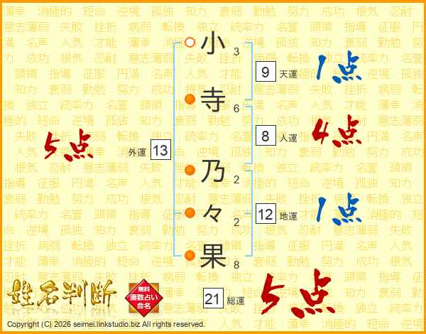 小(3画)寺(6画) 乃(2画)々(2画)果(8画)