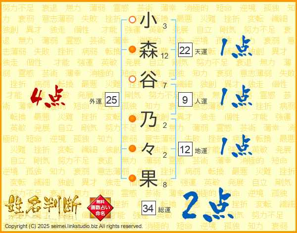小(3画)森(12画)谷(7画) 乃(2画)々(2画)果(8画)