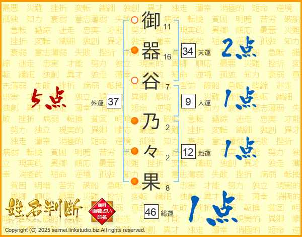御(11画)器(16画)谷(7画) 乃(2画)々(2画)果(8画)