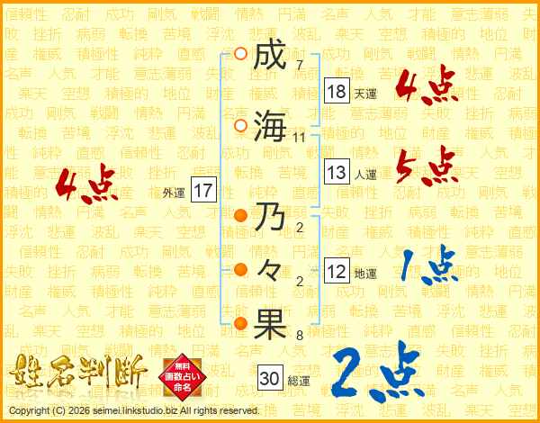 成(7画)海(11画) 乃(2画)々(2画)果(8画)