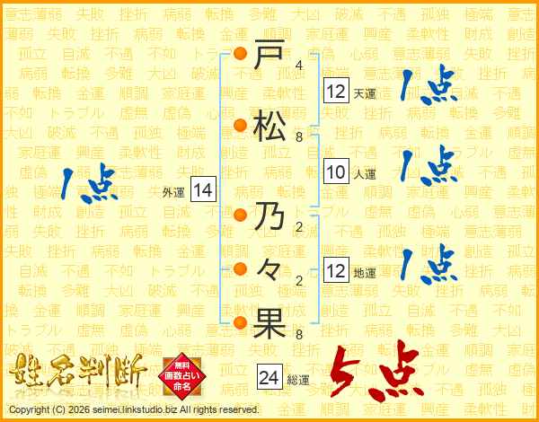 戸(4画)松(8画) 乃(2画)々(2画)果(8画)