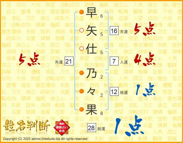 生活面を象徴する運勢です。外部から受ける影響力を表し、結婚運、家庭運や職場、環境への順応性を表します。総運から人運を引いた画数。姓や名が1文字の場合を除く。