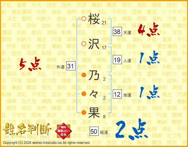 桜(21画)沢(17画) 乃(2画)々(2画)果(8画)