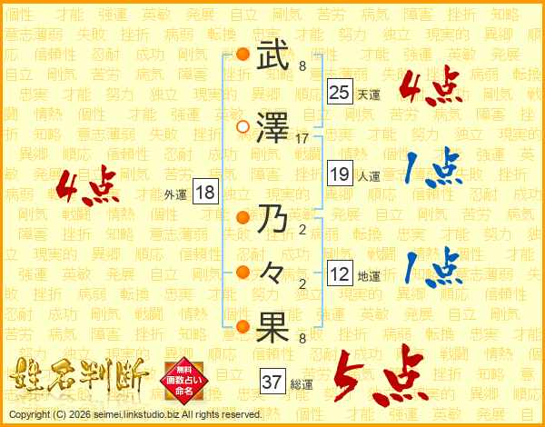 武(8画)澤(17画) 乃(2画)々(2画)果(8画)