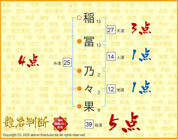稲(15画)冨(12画) 乃(2画)々(2画)果(8画)