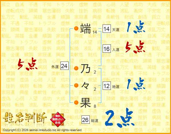 生活面を象徴する運勢です。外部から受ける影響力を表し、結婚運、家庭運や職場、環境への順応性を表します。総運から人運を引いた画数。姓や名が1文字の場合を除く。